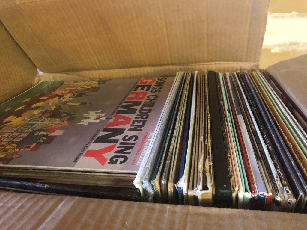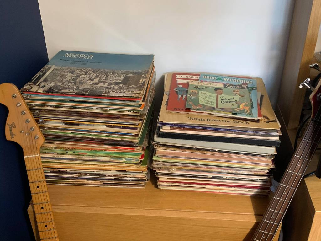 In October, a friend of mine needed more space at home for their thriving chilli growing and needed to clear out some old records they used for arts workshops. I quickly messaged them and said I would be happy to give the records a home, so in addition to listening to music from our personal archives, I found myself immersed in a forgotten collection of music. This made me reminisce on my days back in California when I would go digging through records for odd sounds I could incorporate into the things I was making. I still have a large box of records at my mom’s house in California (the photo on the right), but now I had a much bigger collection of vinyl in my house (the photo on the left)!